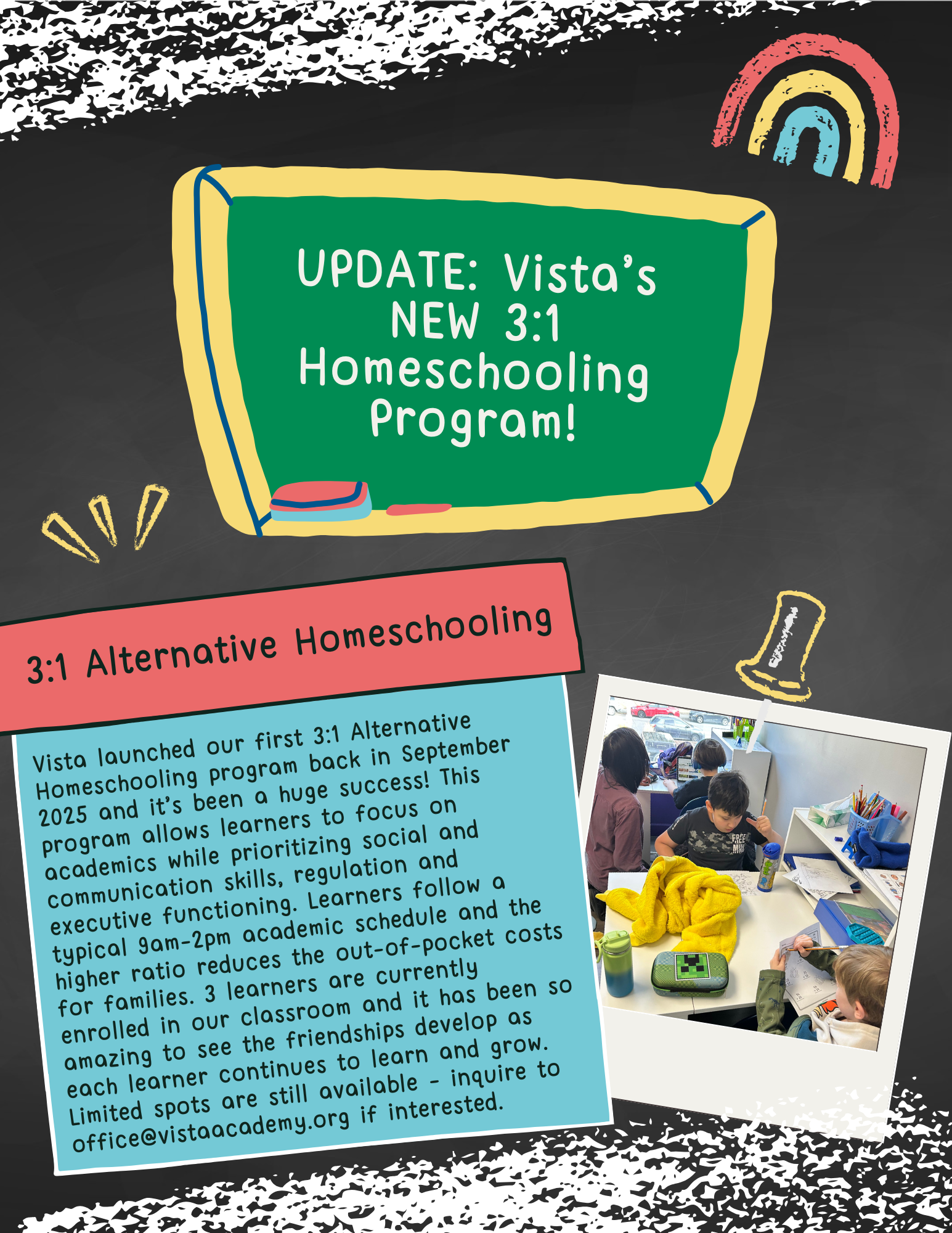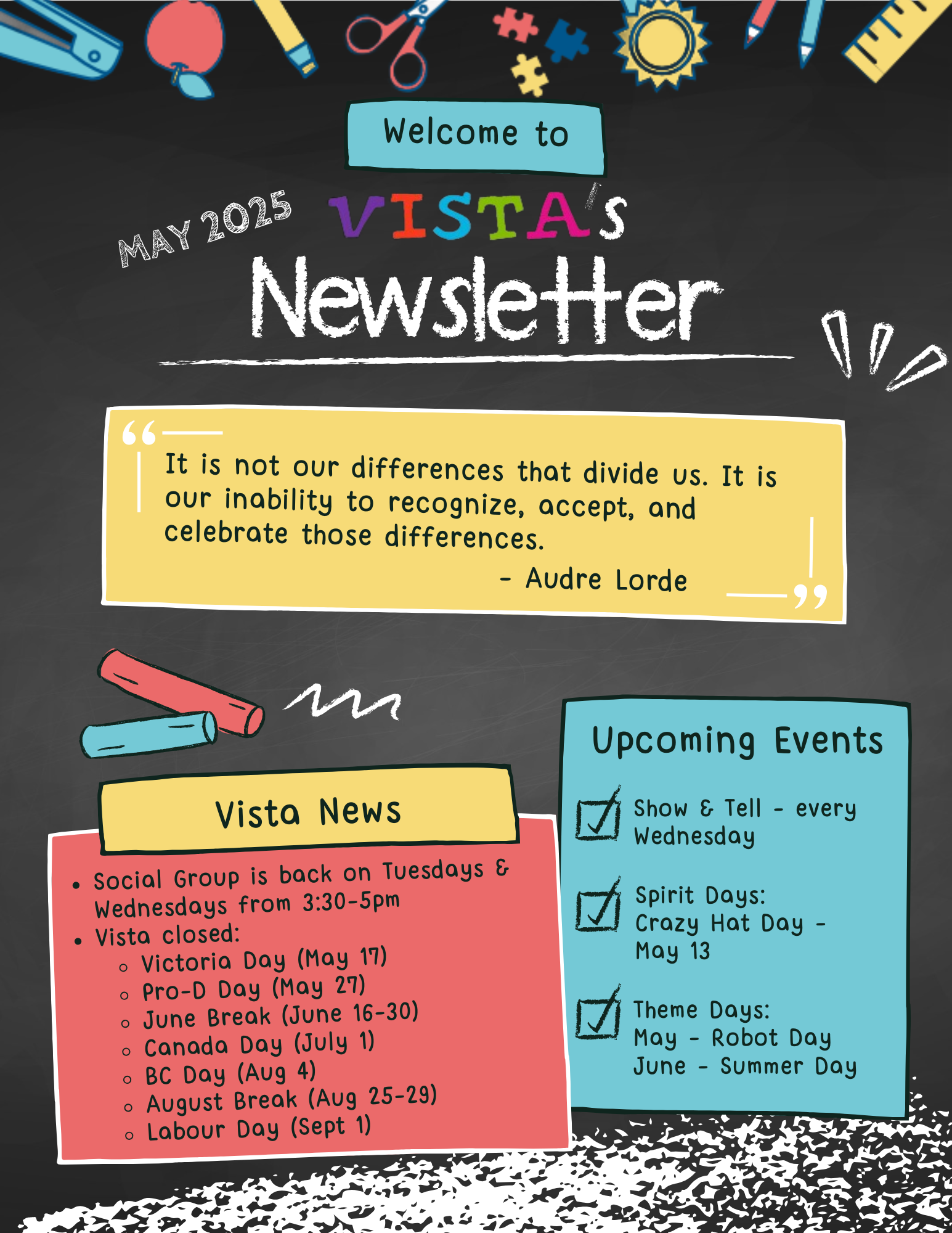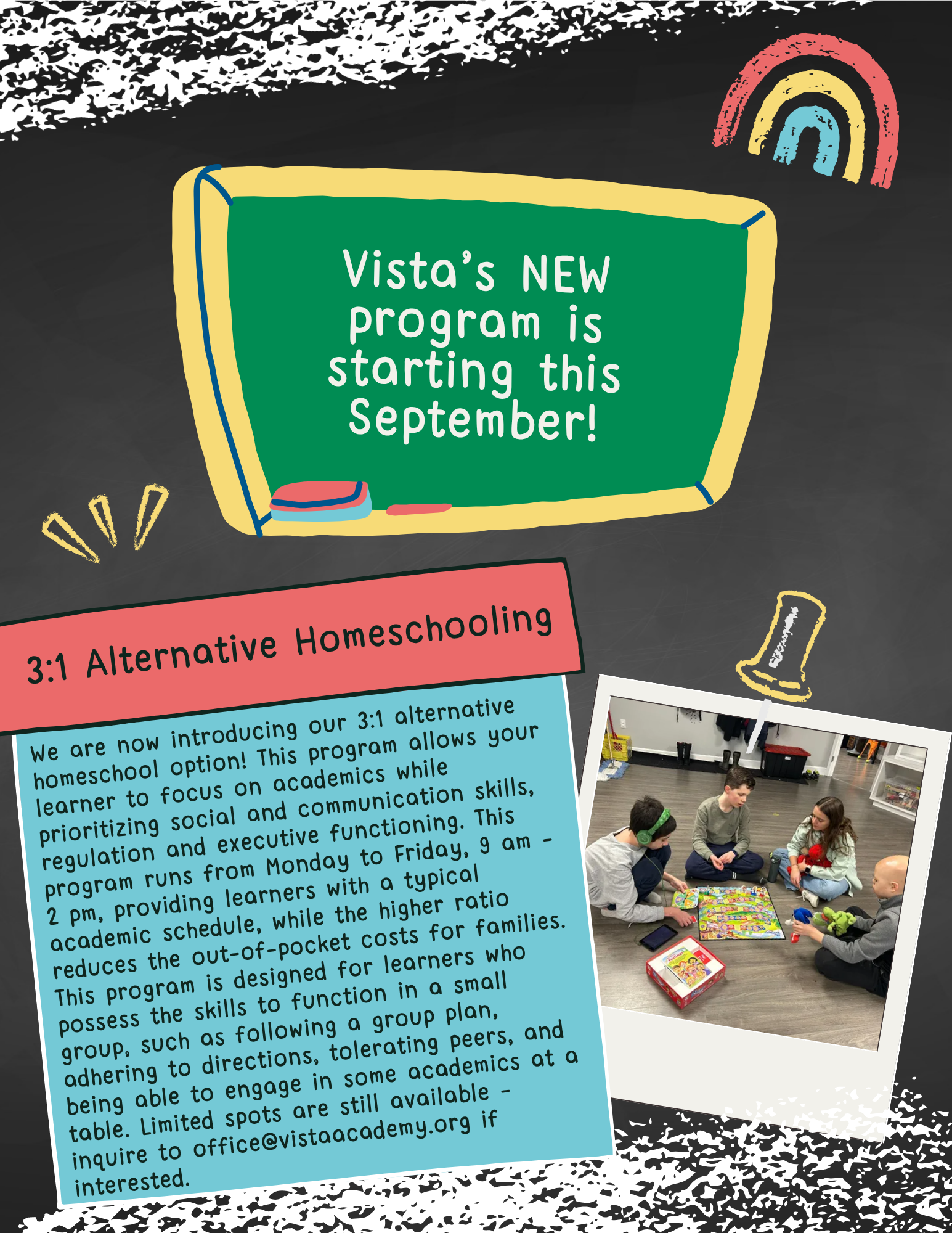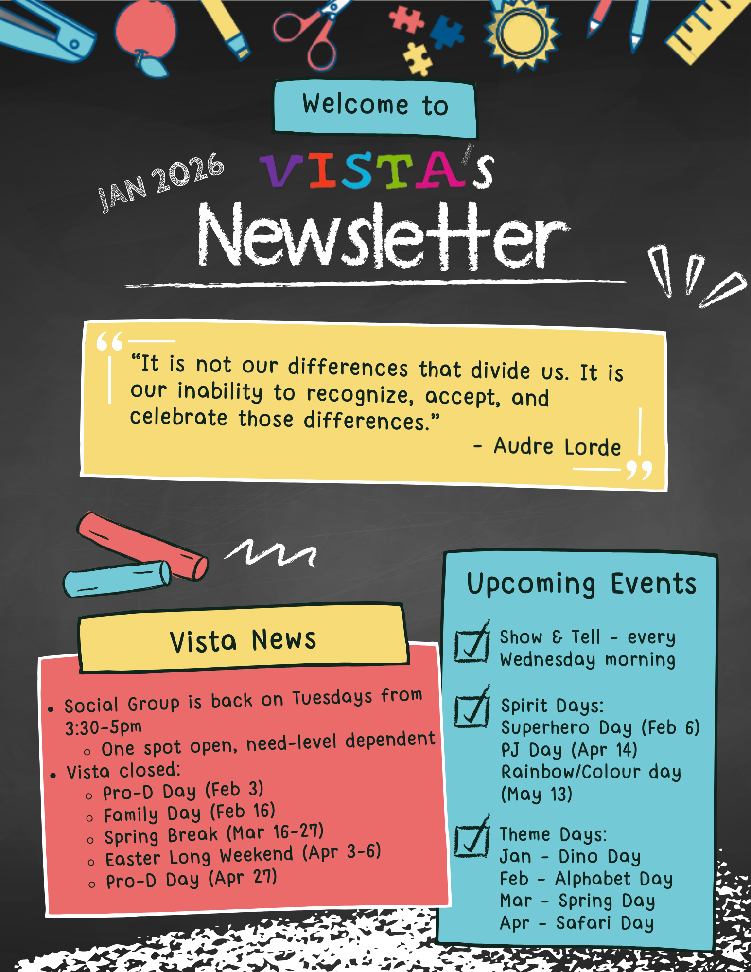 In our January 2025 Newsletter, we highlighted exciting VISTA updates and events, announced the launch of our new 3:1 program starting this September, and shared local news and happenings. The edition also featured a Student Spotlight, a Community Spotlight on Steve Cox, valuable resources, and an insightful piece on language development and gestalts.