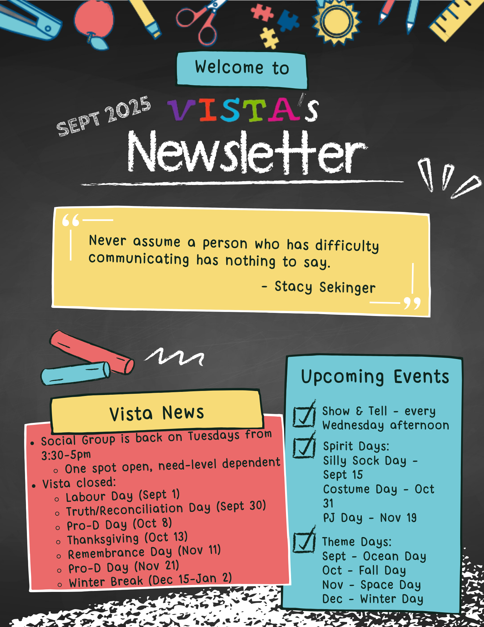 To start the new school year our September Newsletter showcased VISTA events, local events, general news, our community spotlight (Anishia Denee) and a snippet on Reinforcement in ABA.